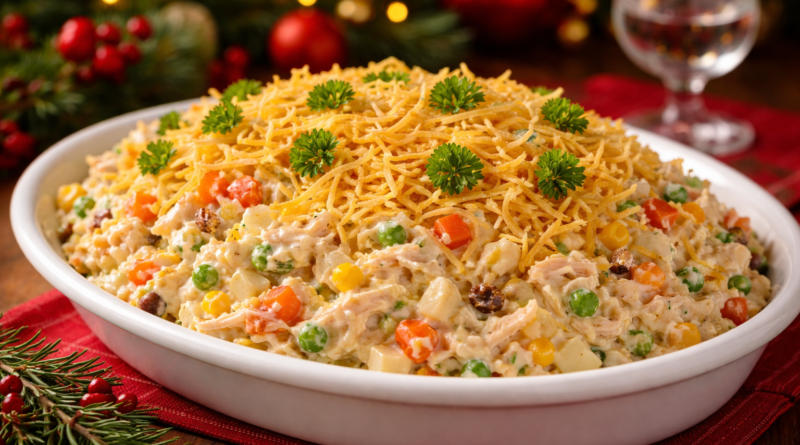 Em uma tigela, misture o frango, a cenoura, a maçã, o milho e a ervilha. Acrescente a maionese, ajuste o sal e finalize com cheiro-verde. Cubra com batata palha somente na hora de servir