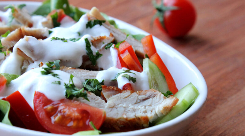 Grelhe o frango apenas com sal. Em uma tigela grande, misture as folhas, a cenoura e o tomate. Acrescente o frango desfiado, tempere com limão e azeite. Sirva na hora.